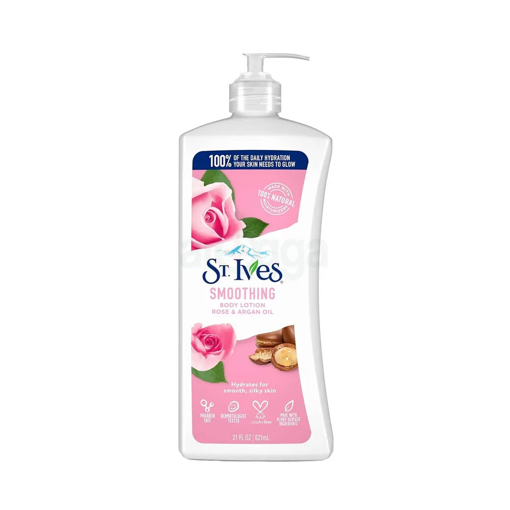- ST. IVES SMOOTHING BODY LOTION made with rose and argan oil, this moisturizing lotion delivers 100% of the daily hydration your skin needs to glow